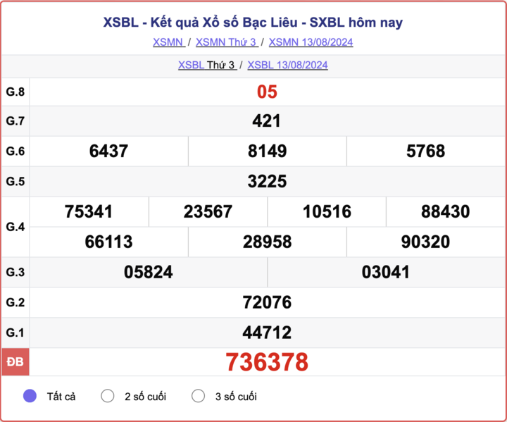 XSBL 20/8. Kết quả xổ số Bạc Liêu hôm nay - XSBL thứ Ba ngày 20/8/2024 sẽ được cập nhật nhanh chóng và chính xác nhất trên phuongtruongan.vn. Kết quả các giải thưởng của XSBL ngày 20/8/2024 sẽ được công bố lần lượt từ giải nhất cho đến giải tám, cuối cùng là giải đặc biệt.