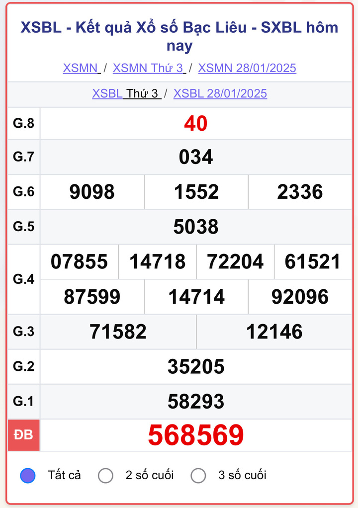 Xem lại kết quả xổ số Bạc Liêu hôm nay ngày 28/1/2025