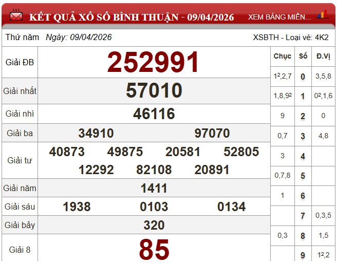 Kết quả xổ số Bình Thuận ngày 9/4/2026