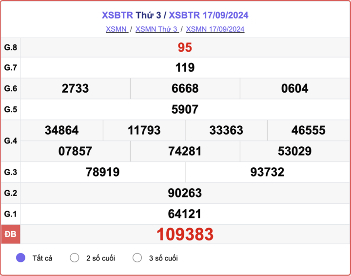 XSBTR 1/10. Kết quả xổ số Bến Tre hôm nay - XSBTR thứ Ba ngày 1/10/2024 sẽ được cập nhật nhanh chóng và chính xác nhất trên LDG.COM.VN. Kết quả các giải thưởng của XSBTR ngày 1/10/2024 sẽ được công bố lần lượt từ giải nhất cho đến giải tám, cuối cùng là giải đặc biệt.