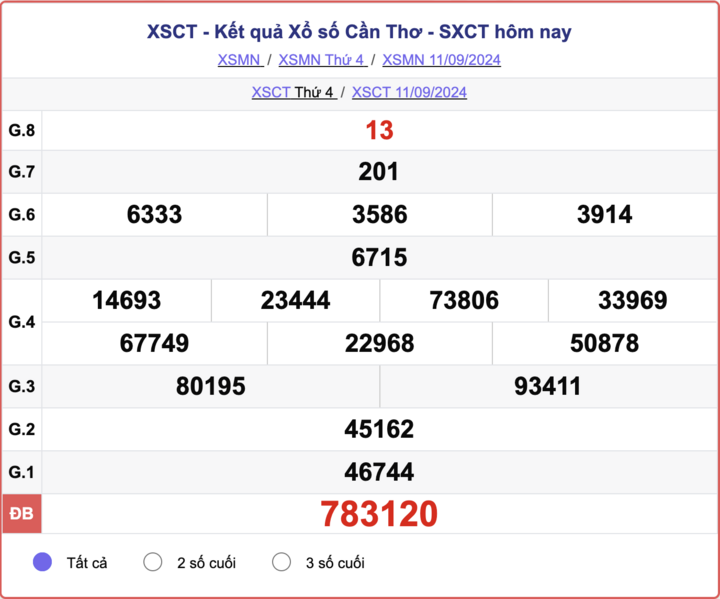 XSCT 18/9 - Kết quả xổ số Cần Thơ hôm nay - XSCT thứ Tư ngày 18/9/2024 sẽ được cập nhật nhanh chóng và chính xác nhất trên phuongtruongan.vn. Kết quả các giải thưởng của XSCT ngày 18/9/2024 sẽ được công bố lần lượt từ giải nhất cho đến giải tám, cuối cùng là giải đặc biệt.