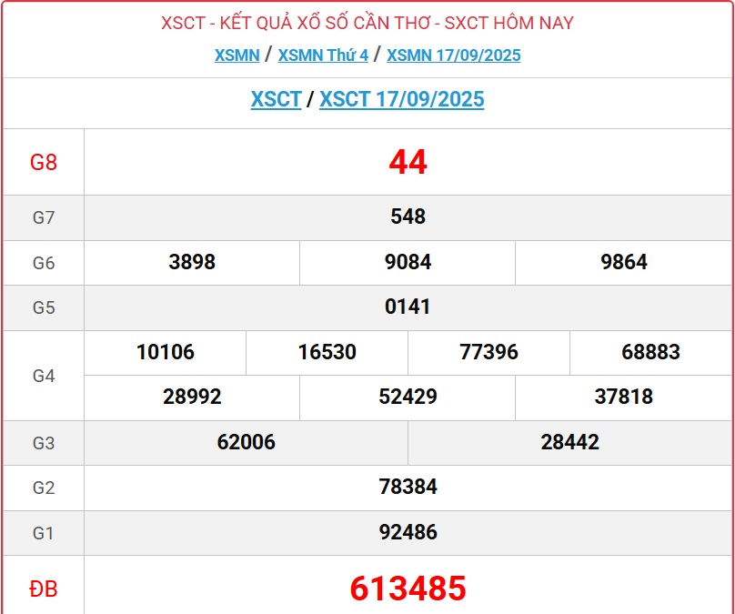 Kết quả xổ số Cần Thơ Thứ Tư ngày 17/9/2025