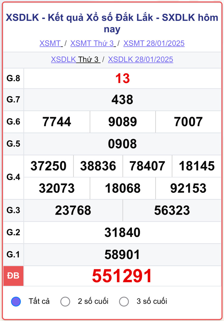 Xem lại Kết quả xổ số Đắk Lắk Thứ Ba ngày 28/01/2024