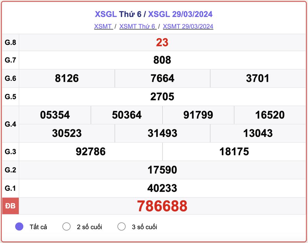 - Kết quả XSGL ngày 29/3/2024