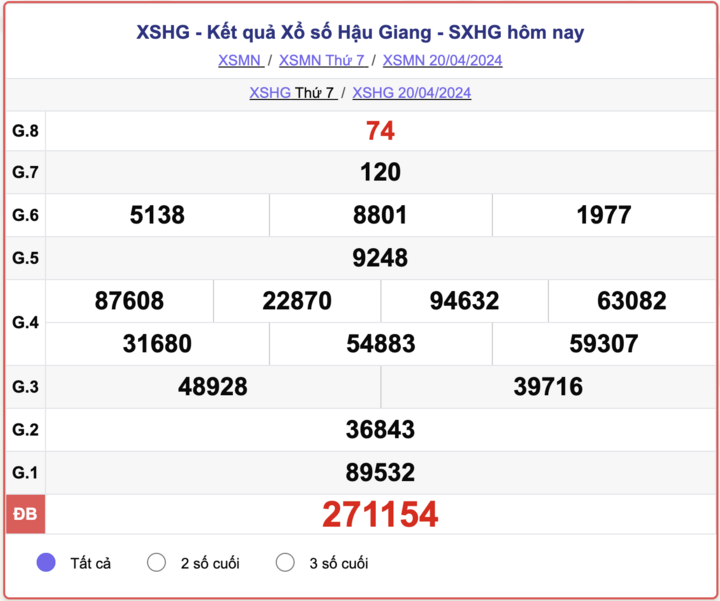 XSHG thứ 7, kết quả xổ số Hậu Giang ngày 20/4/2024.