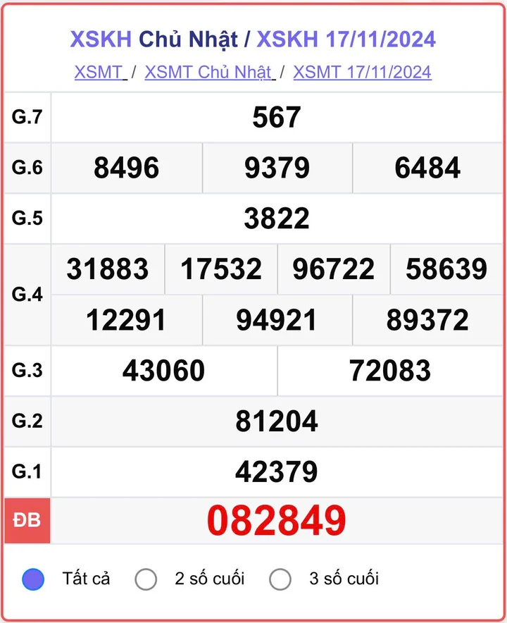 | Giải phụ đặc biệt: Sai một chữ số ở hàng trăm ngàn so với giải đặc biệt | 9 | 50.000.000 VNĐ |