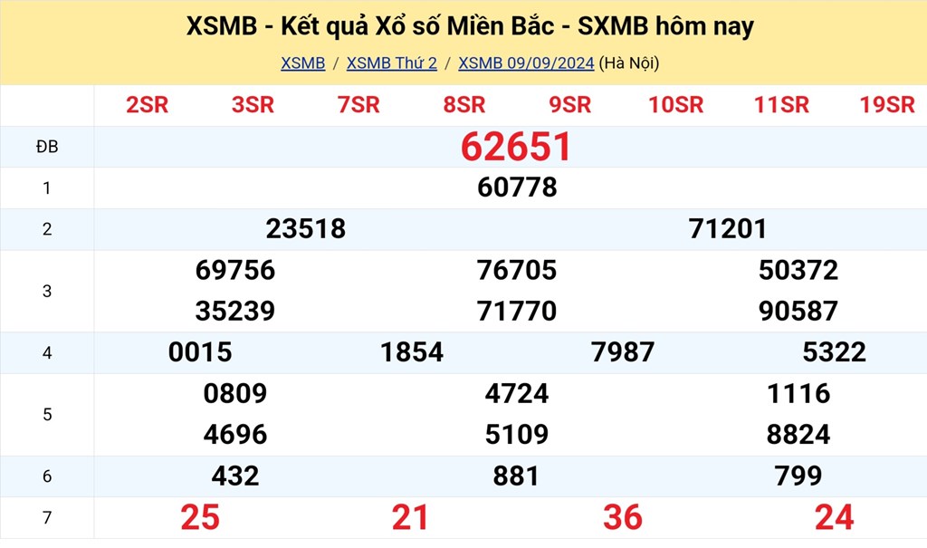XSMB 9/9, kết quả xổ số miền Bắc hôm nay 9/9/2024.