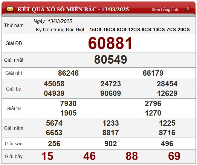Cập nhật Kết quả xổ số miền Bắc hôm nay 13/3/2026 - XSMB 13/3/2026 nhanh nhất và chính xác nhất.