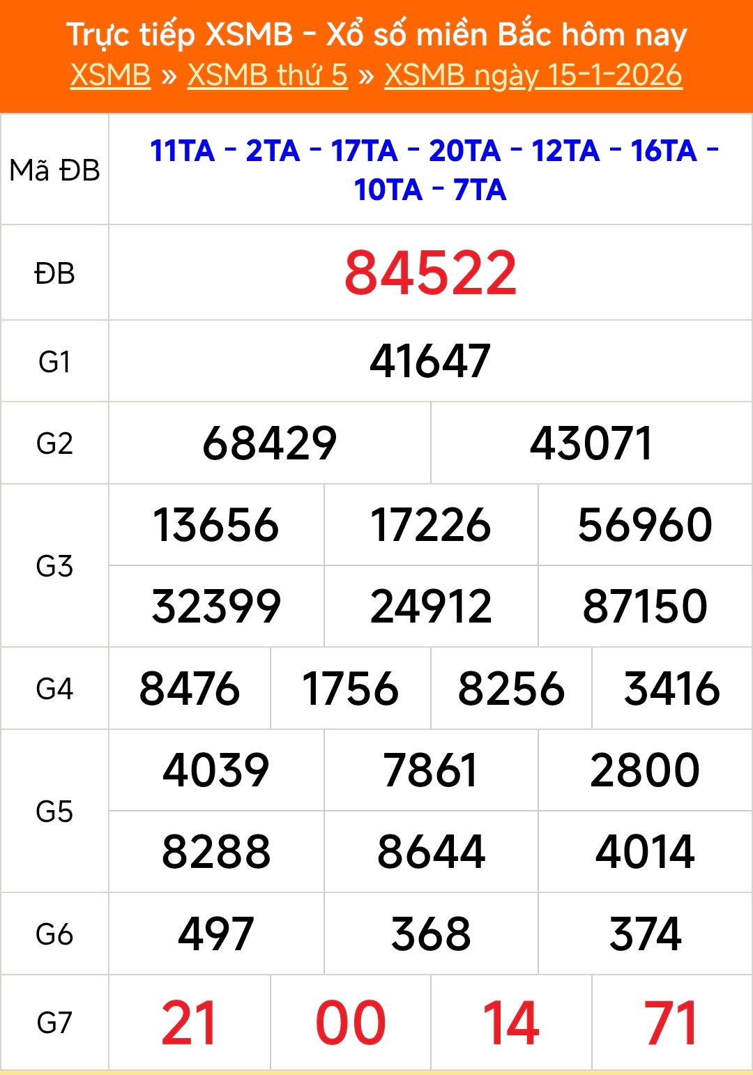 Cập nhật Kết quả xổ số miền Bắc hôm nay 15/1/2026 - XSMB 15/1/2026 nhanh nhất và chính xác nhất tới quý độc giả.