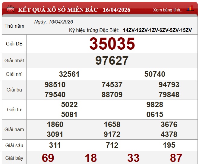 Kết quả Xổ số miền Bắc ngày 16/4/2026
