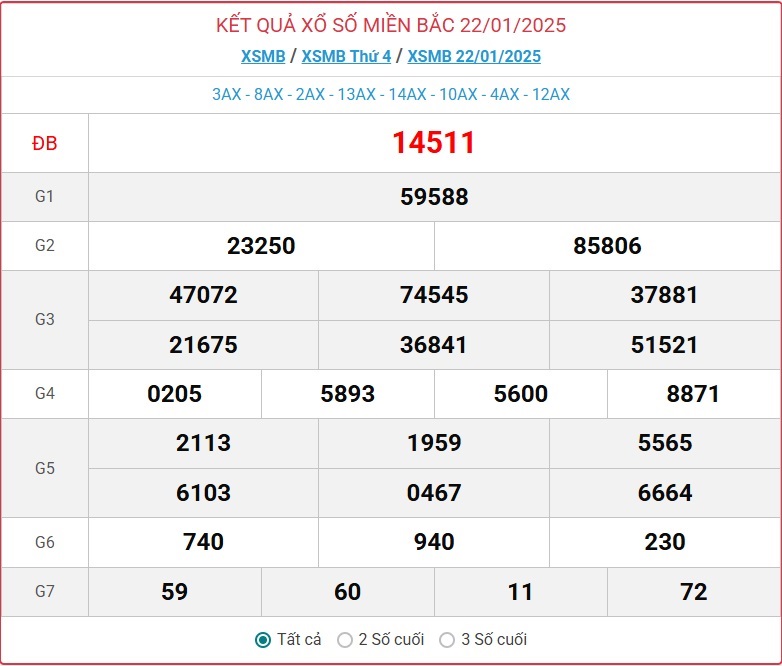 Kết quả xổ số miền Bắc (XSMB) được thực hiện lúc 18 giờ 15 phút và được mở thưởng bởi Công ty xổ số kiến thiết Nam Định (XSNĐ). Xổ số hôm nay - KQXSMB ngày 25/1 được quay thưởng bắt đầu từ giải nhất cho đến giải bảy, cuối cùng là công bố kết quả giải đặc biệt.