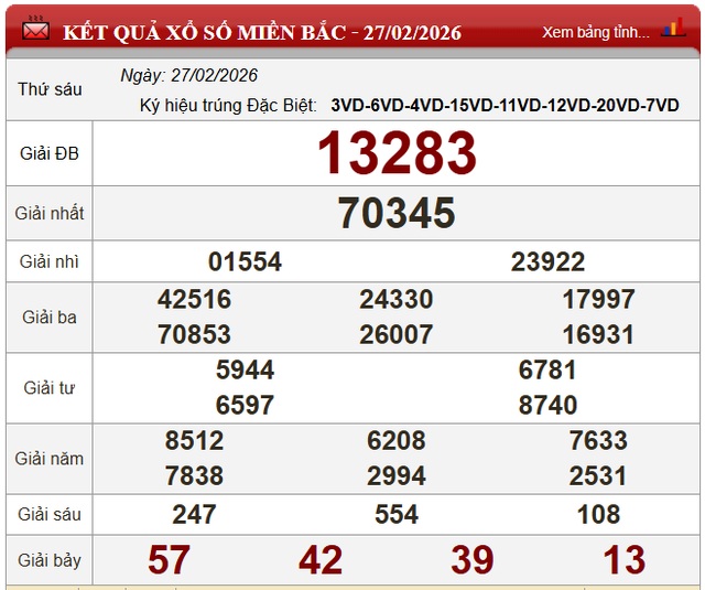 Kết quả Xổ số miền Bắc ngày 27/2/2026