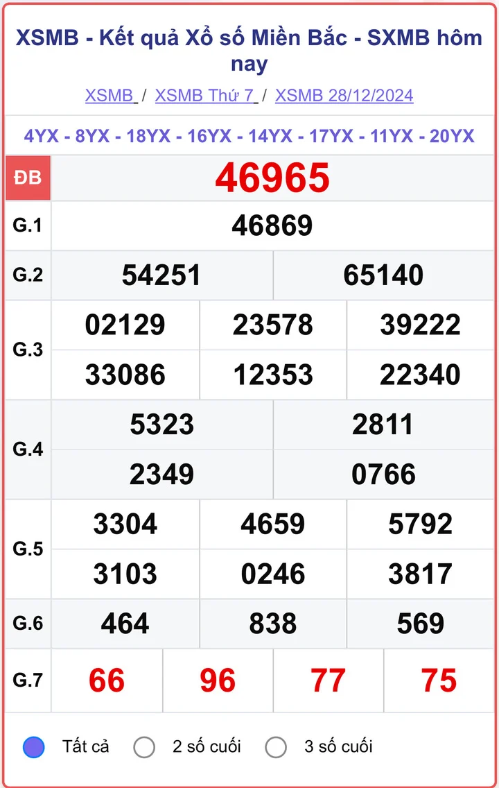 Kết quả xổ số miền Bắc (XSMB) được thực hiện lúc 18 giờ 15 phút và được mở thưởng bởi Công ty xổ số kiến thiết thủ đô Hà Nội (XSNĐ). Xổ số hôm nay - KQXSMB ngày 30/12 được quay thưởng bắt đầu từ giải nhất cho đến giải bảy, cuối cùng là công bố kết quả giải đặc biệt.