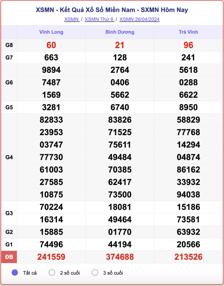 - Kết quả XSMN ngày 26/4/2024