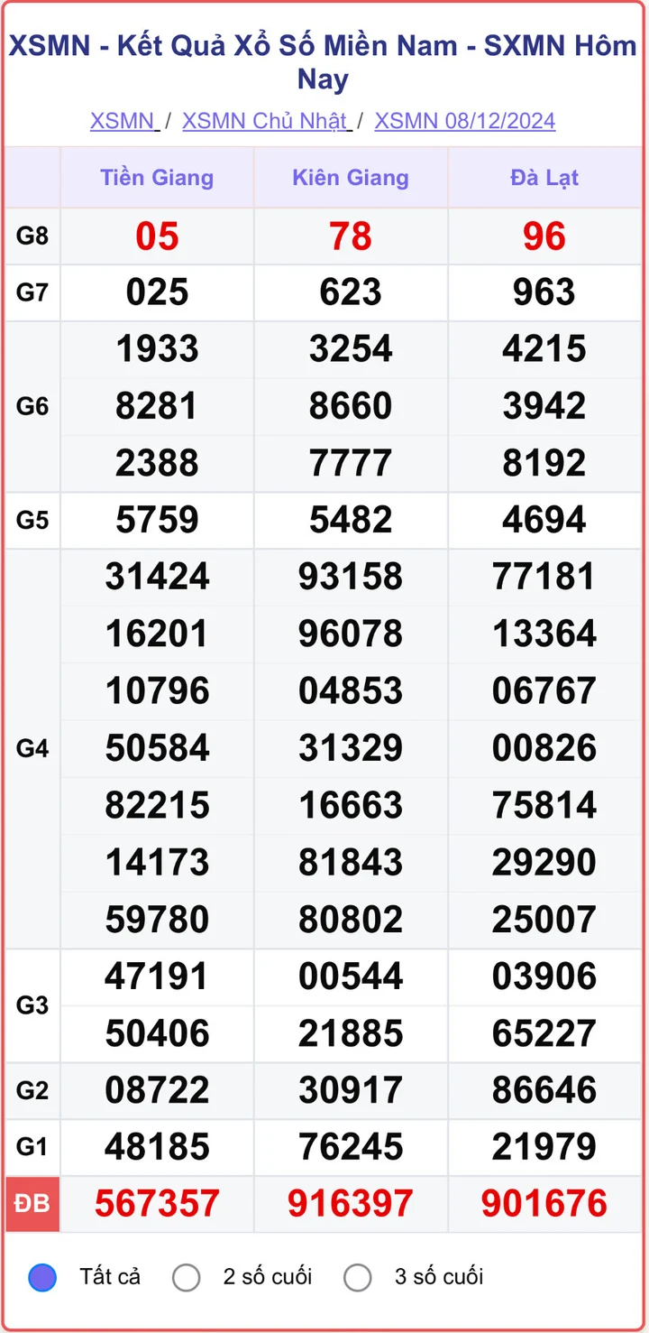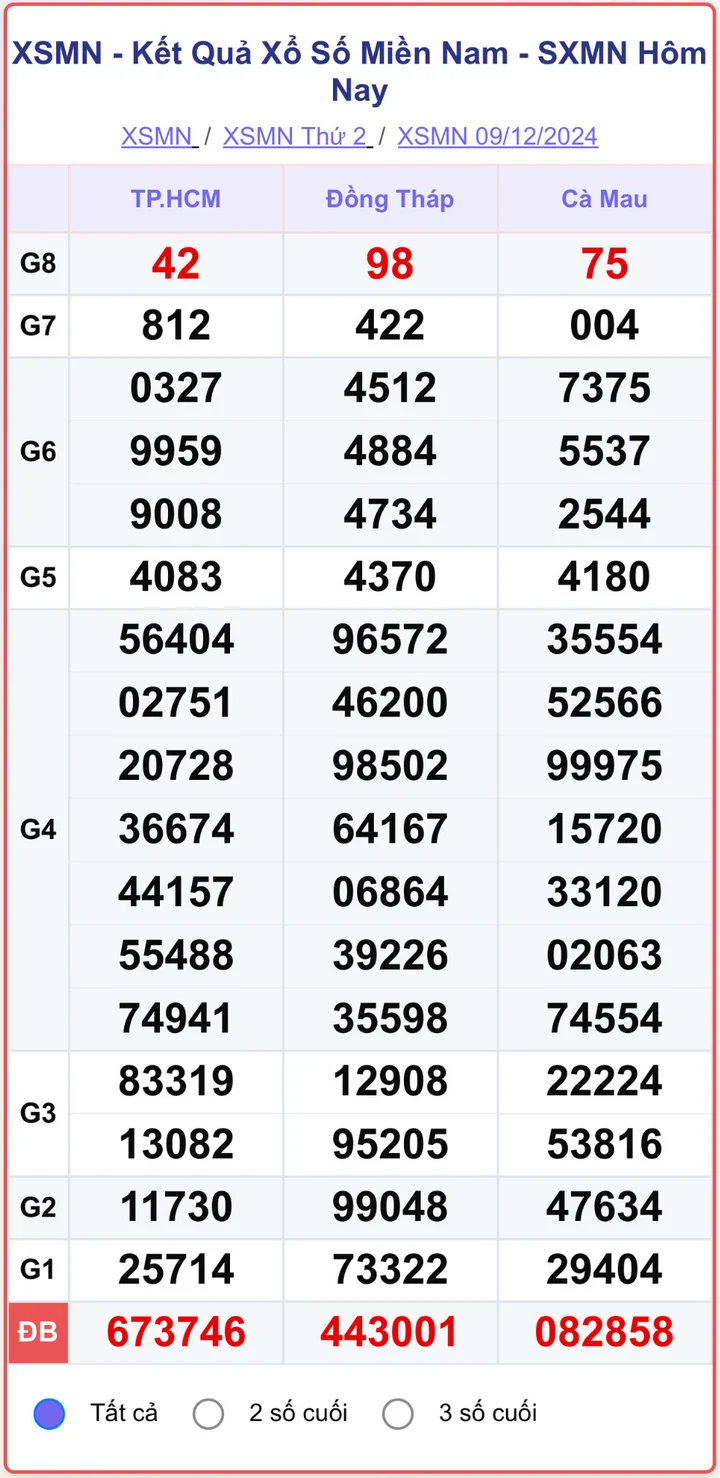 XSMN 12/12. Kết quả xổ số miền Nam hôm nay - XSMN thứ Năm ngày 12/12/2024 sẽ được cập nhật trực tiếp trên LDG. Kết quả các giải thưởng của XSMN ngày 12/12/2024 được công bố lần lượt từ giải nhất cho đến giải tám, cuối cùng là giải đặc biệt.