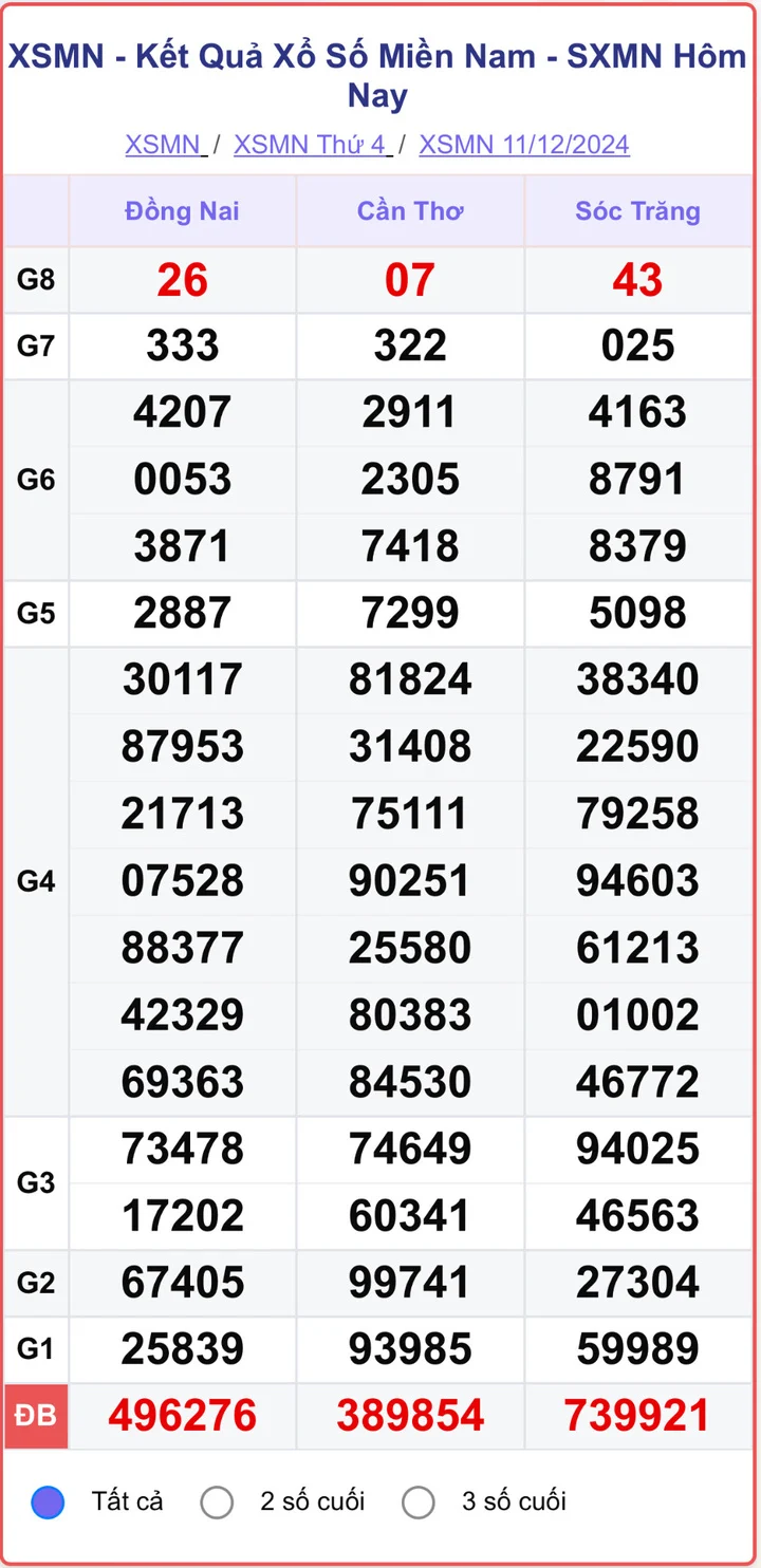 XSMN 14/12. Kết quả xổ số miền Nam hôm nay - XSMN thứ Bảy ngày 14/12/2024 sẽ được cập nhật trực tiếp trên LDG. Kết quả các giải thưởng của XSMN ngày 14/12/2024 được công bố lần lượt từ giải nhất cho đến giải tám, cuối cùng là giải đặc biệt.