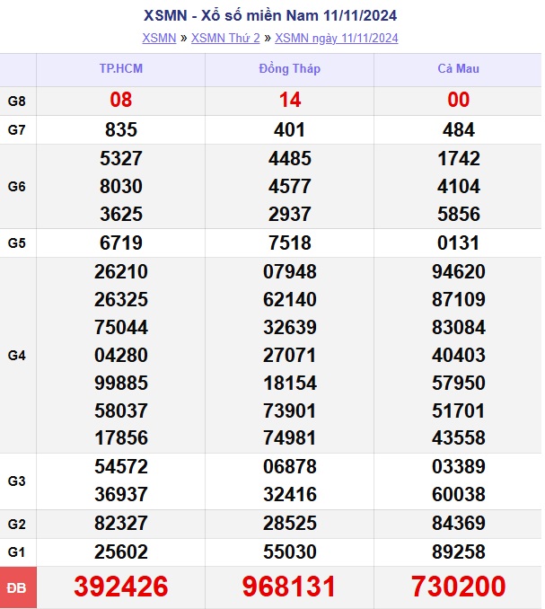 XSMN 15/11. Kết quả xổ số miền Nam hôm nay - XSMN thứ Sáu ngày 15/11/2024 sẽ được cập nhật trực tiếp trên LDG. Kết quả các giải thưởng của XSMN ngày 15/11/2024 được công bố lần lượt từ giải nhất cho đến giải tám, cuối cùng là giải đặc biệt.