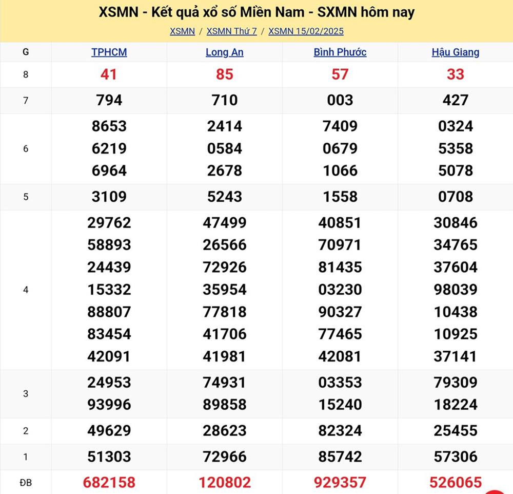 Kết quả xổ số miền Nam (XSMN) được thực hiện lúc 16 giờ 30 phút và được mở thưởng bởi Công ty xổ số kiến thiết của tp hồ chí minh (XSHCM), Cà Mau (XSCM), Đồng Tháp(XSDT). Kết quả của đài nào sẽ được mở thưởng tại trường quay của tỉnh đó. Xổ số hôm nay - KQXSMN ngày 17/2 được quay thưởng bắt đầu từ giải tám cho đến giải nhất, cuối cùng là công bố kết quả giải đặc biệt.