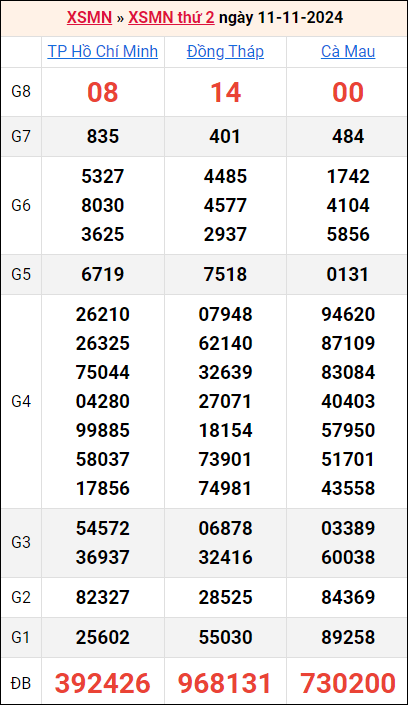 XSMN 18/11. Kết quả xổ số miền Nam hôm nay - XSMN thứ Hai ngày 18/11/2024 sẽ được cập nhật trực tiếp trên LDG. Kết quả các giải thưởng của XSMN ngày 18/11/2024 được công bố lần lượt từ giải nhất cho đến giải tám, cuối cùng là giải đặc biệt.