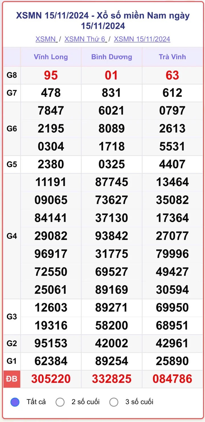 - Thứ 6 hàng tuần xổ số miền Nam được quay thưởng tại Trà Vinh, Bình Dương, Vĩnh Long.