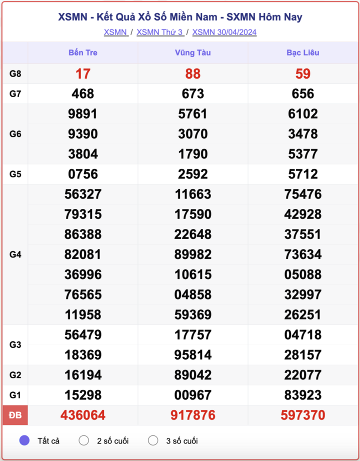 - Kết quả XSMN ngày 30/4/2024