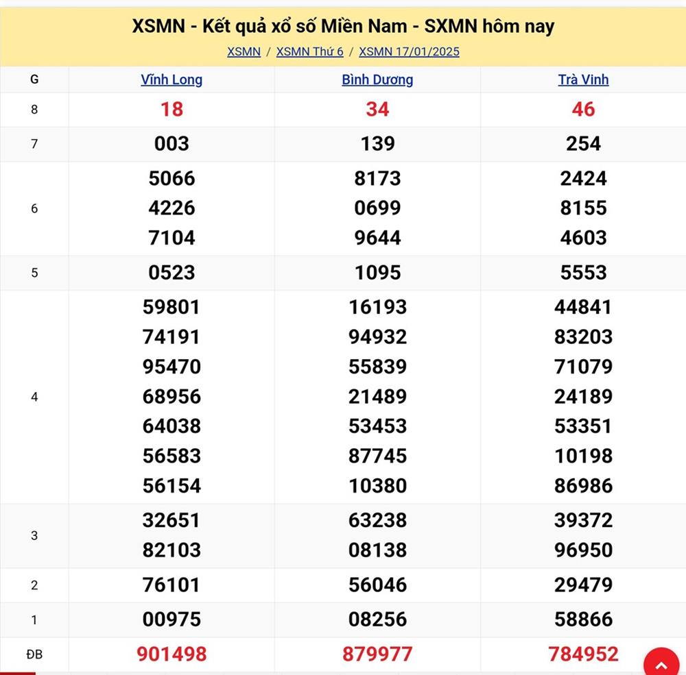 - Thứ 6 hàng tuần xổ số miền Nam được quay thưởng tại Trà Vinh, Bình Dương, Vĩnh Long.