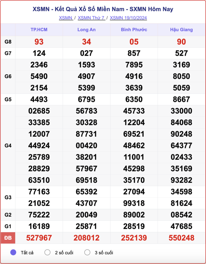 XSMN 22/10. Kết quả xổ số miền Nam hôm nay - XSMN thứ Ba ngày 22/10/2024 sẽ được cập nhật trực tiếp trên LDG. Kết quả các giải thưởng của XSMN ngày 22/10/2024 được công bố lần lượt từ giải nhất cho đến giải tám, cuối cùng là giải đặc biệt.