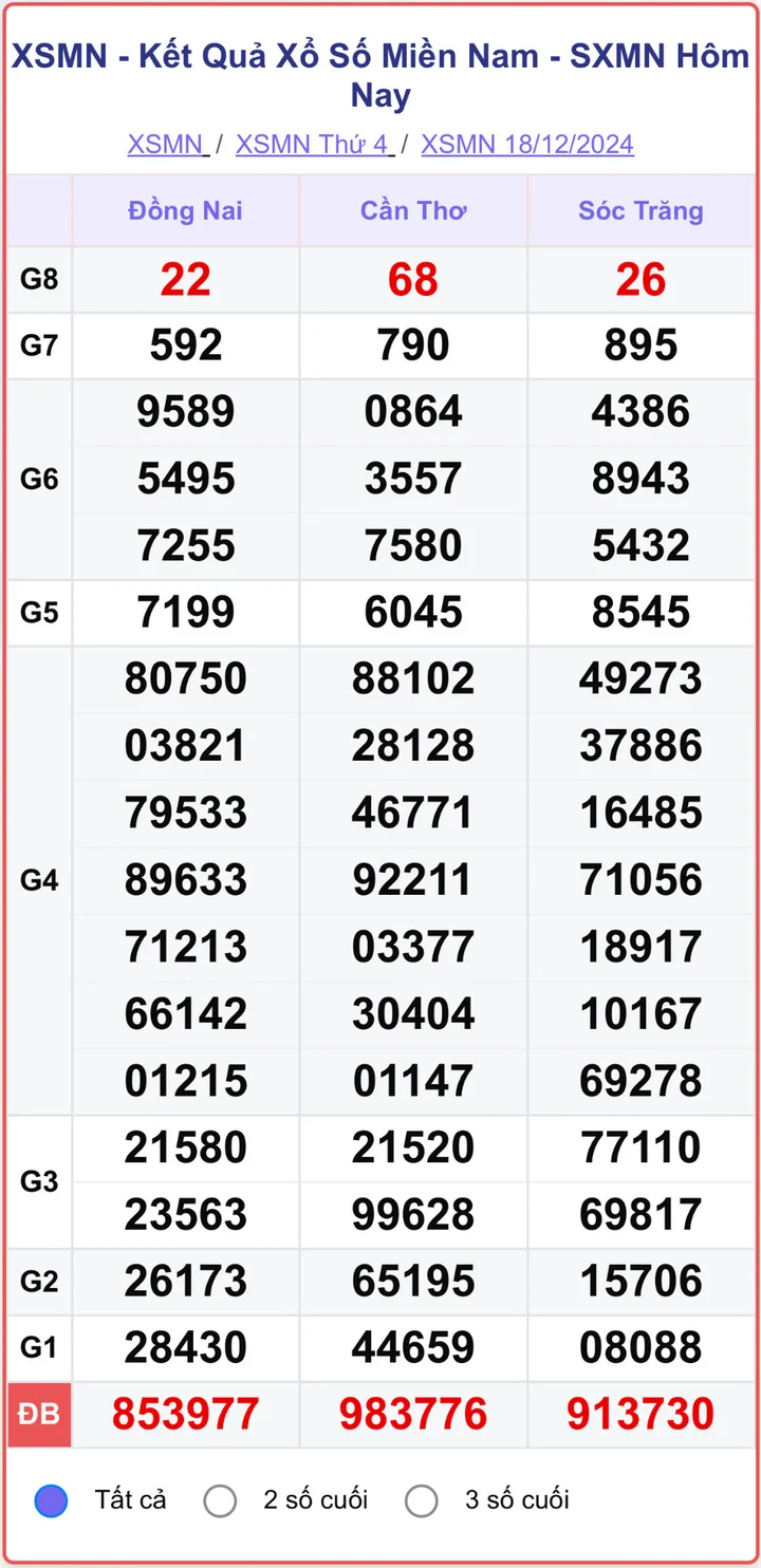 XSMN 22/12. Kết quả xổ số miền Nam hôm nay - XSMN chủ nhật ngày 21/12/2024 sẽ được cập nhật trực tiếp trên LDG. Kết quả các giải thưởng của XSMN ngày 22/12/2024 được công bố lần lượt từ giải nhất cho đến giải tám, cuối cùng là giải đặc biệt.