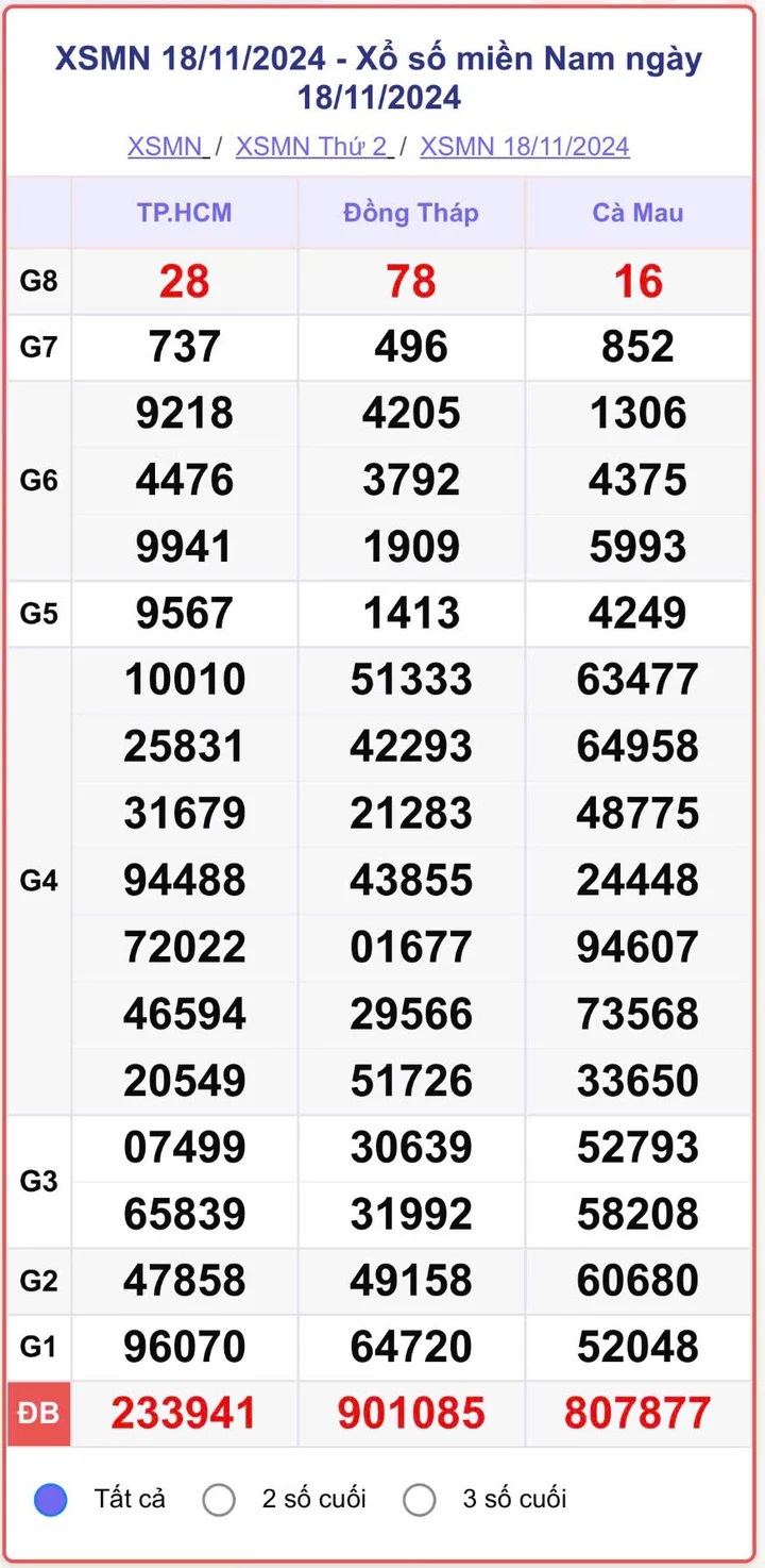 XSMN 18/11, kết quả xổ số miền Nam hôm nay 18/11/2024.