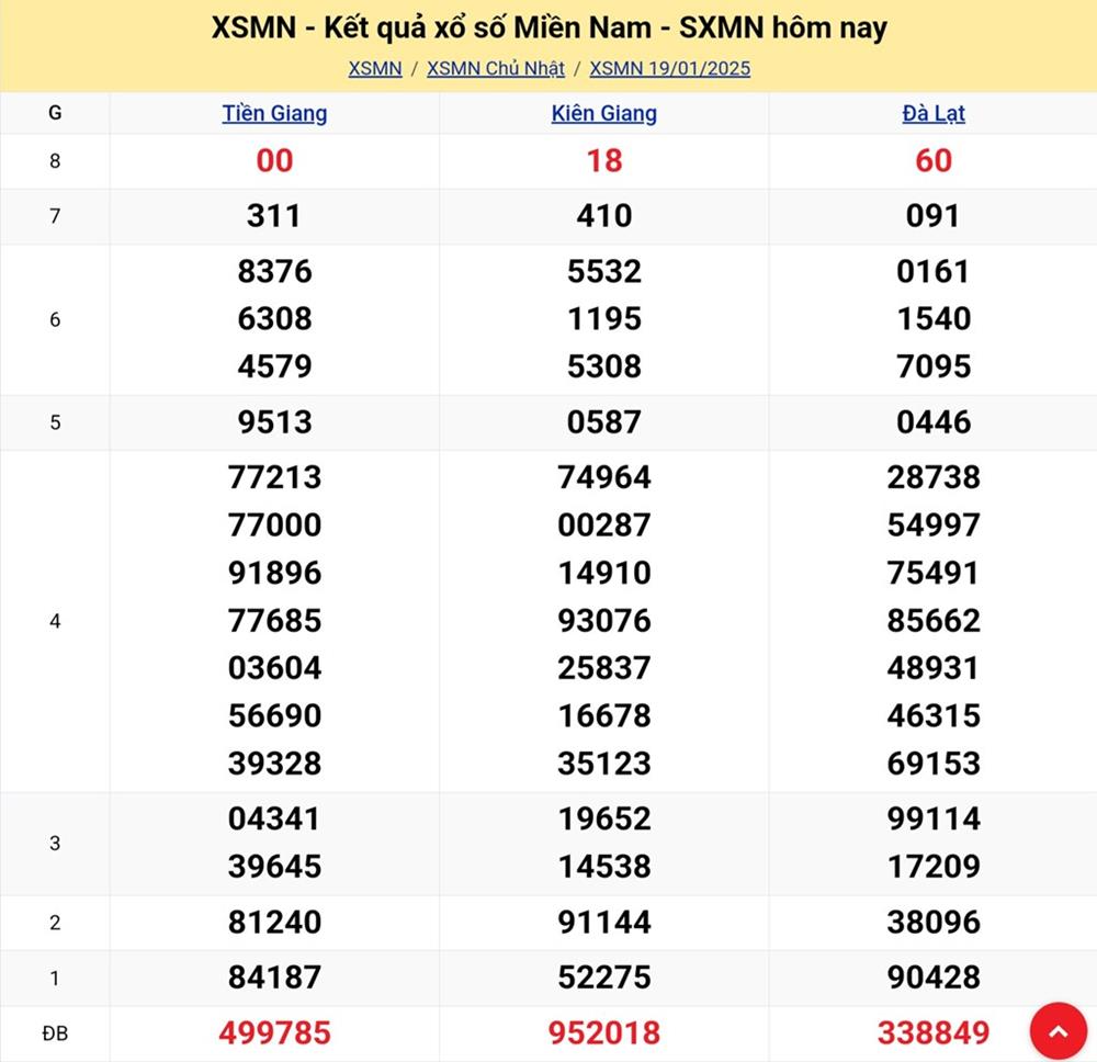 - Chủ nhật hàng tuần xổ số miền Nam được mở thưởng tại Kiên Giang, Tiền Giang, Đà Lạt