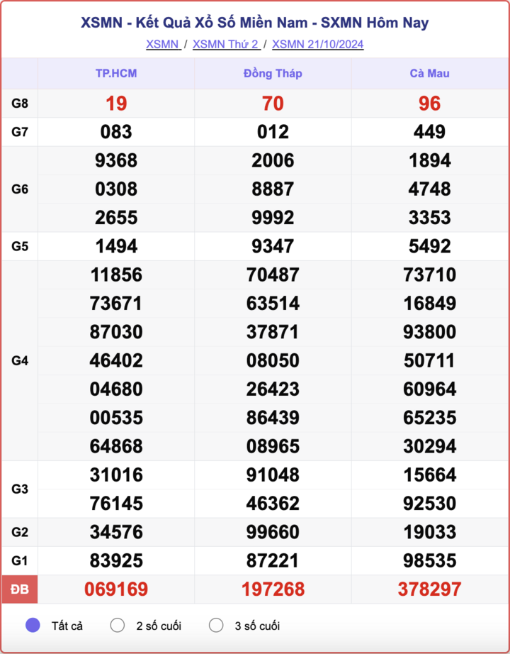 XSMN 21/10, kết quả xổ số miền Nam hôm nay 21/10/2024.