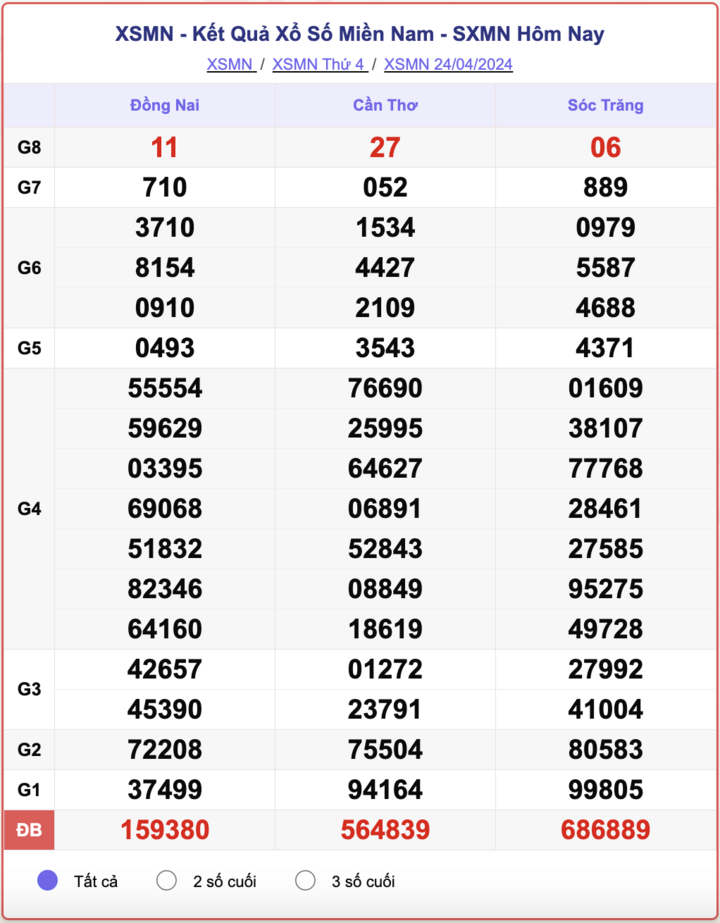 XSMN thứ 4, kết quả xổ số miền Nam ngày 24/4/2024.
