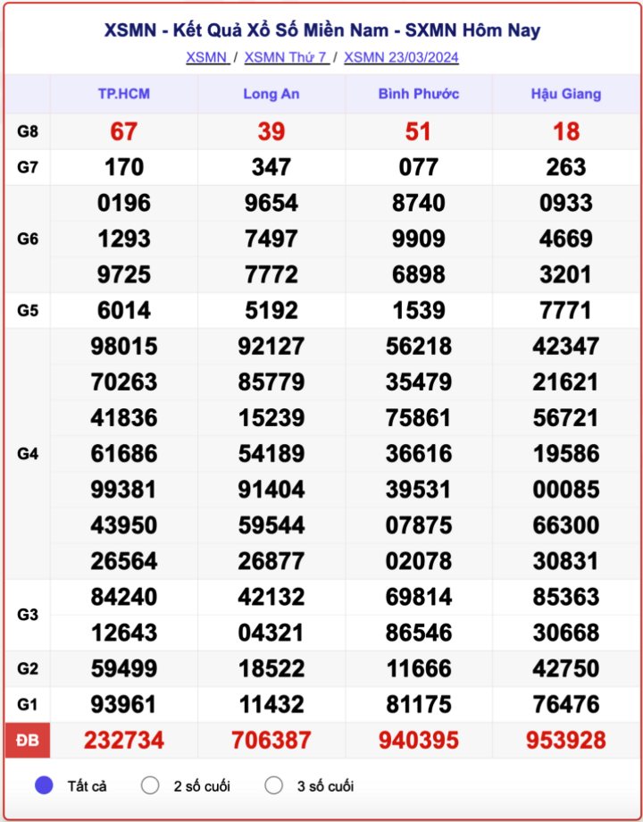 - Kết quả XSMN ngày 23/3/2024