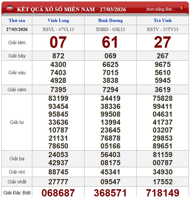 Kết quả xổ số miền Nam ngày 27/3/2026