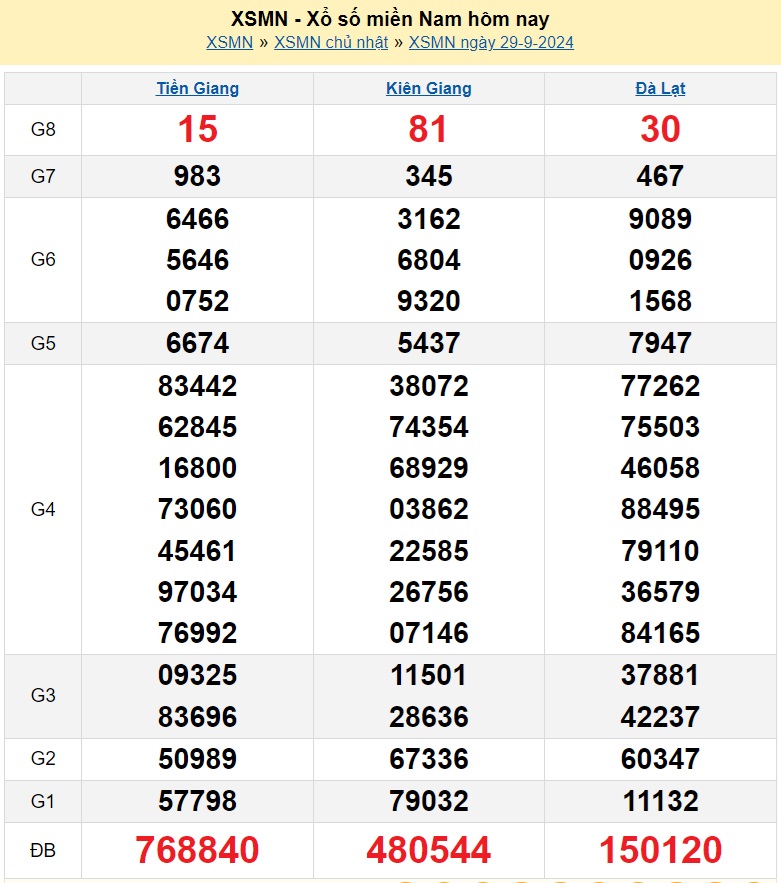- Chủ nhật hàng tuần xổ số miền Nam được quay thưởng tại Kiên Giang, Đà Lạt, Tiền Giang.