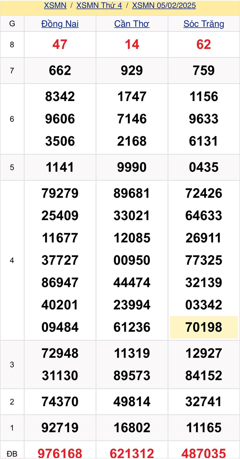 Kết quả xổ số miền Nam (XSMN) được thực hiện lúc 16 giờ 30 phút và được mở thưởng bởi Công ty xổ số kiến thiết của Tiền Giang (XSTG), Đà Lạt (XSĐL), Kiên Giang (XSKG). Kết quả của đài nào sẽ được mở thưởng tại trường quay của tỉnh đó. Xổ số hôm nay - KQXSMN ngày 9/2 được quay thưởng bắt đầu từ giải tám cho đến giải nhất, cuối cùng là công bố kết quả giải đặc biệt.