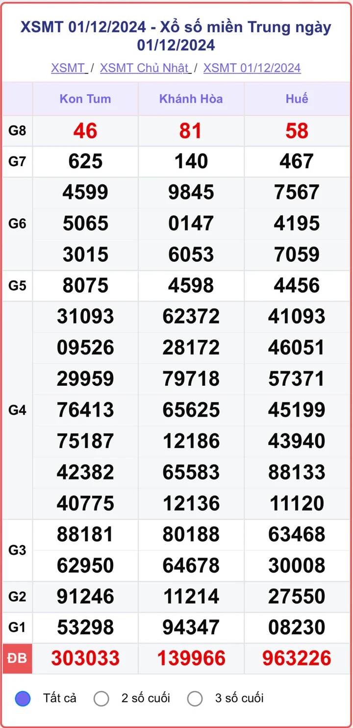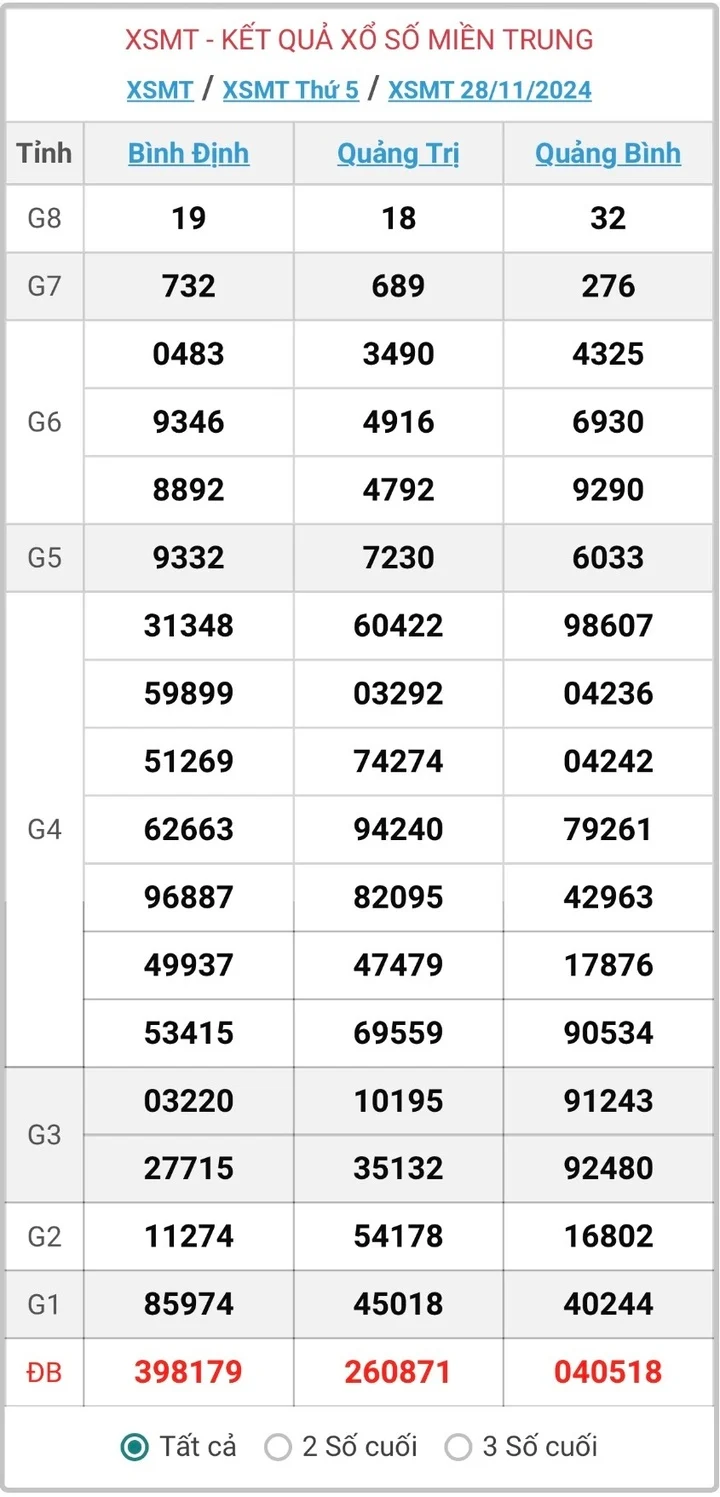 XSMT 5/12. Kết quả xổ số miền Trung hôm nay - XSMT thứ Năm ngày 05/12/2024 sẽ được cập nhật trực tiếp trên LDG. Kết quả các giải thưởng của XSMT ngày 05/12/2024 sẽ được công bố lần lượt từ giải nhất đến giải tám, cuối cùng là giải đặc biệt.