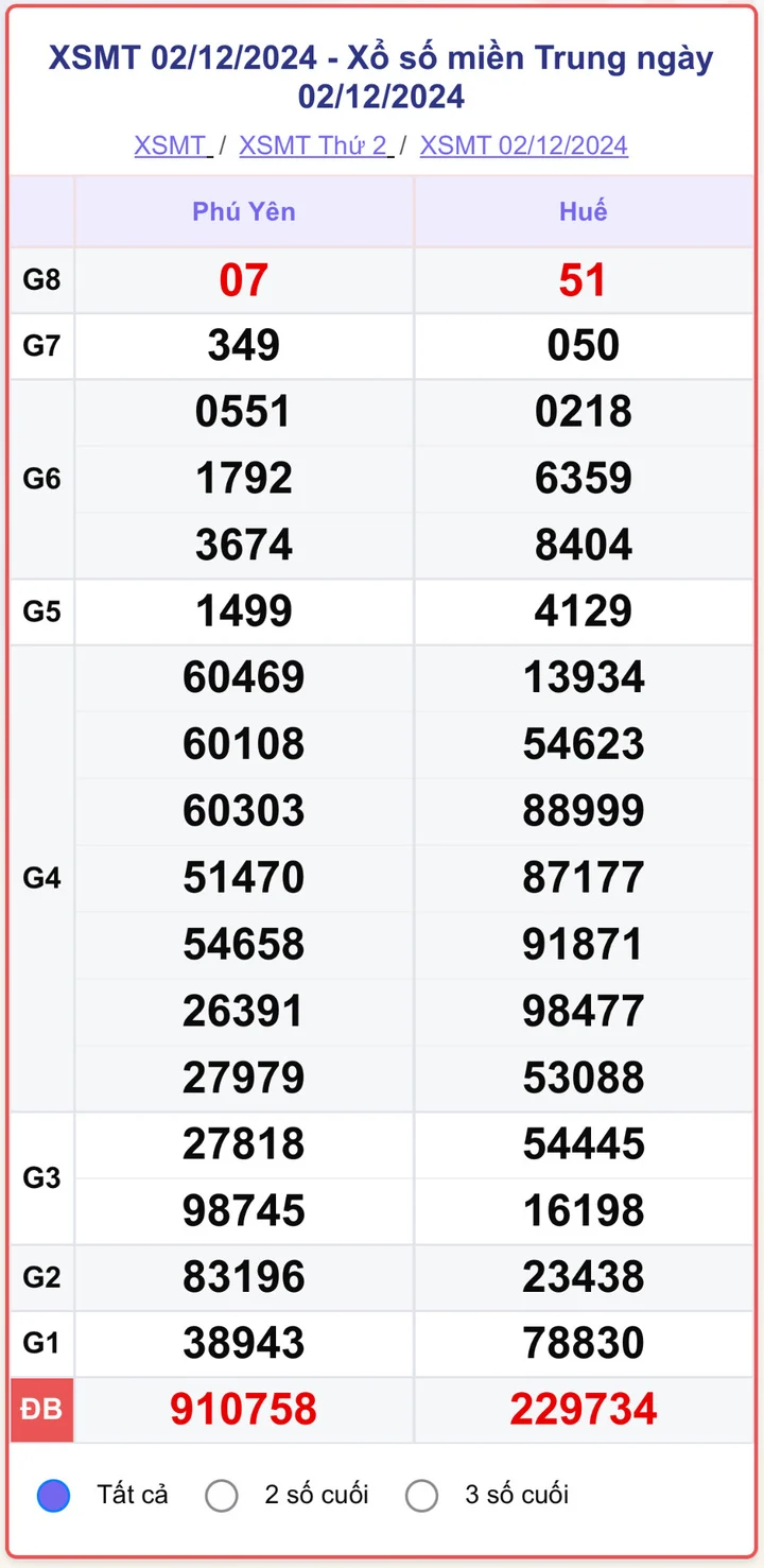 XSMT 07/12. Kết quả xổ số miền Trung hôm nay - XSMT thứ Bảy ngày 07/12/2024 sẽ được cập nhật trực tiếp trên LDG. Kết quả các giải thưởng của XSMT ngày 07/12/2024 sẽ được công bố lần lượt từ giải nhất đến giải tám, cuối cùng là giải đặc biệt.
