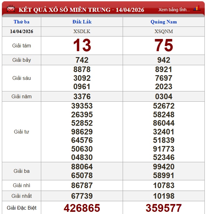 Kết quả xổ số miền Trung (XSMT) hôm nay ngày 14/4