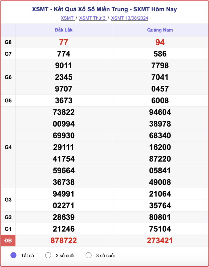 - XSMT 13/8/2024