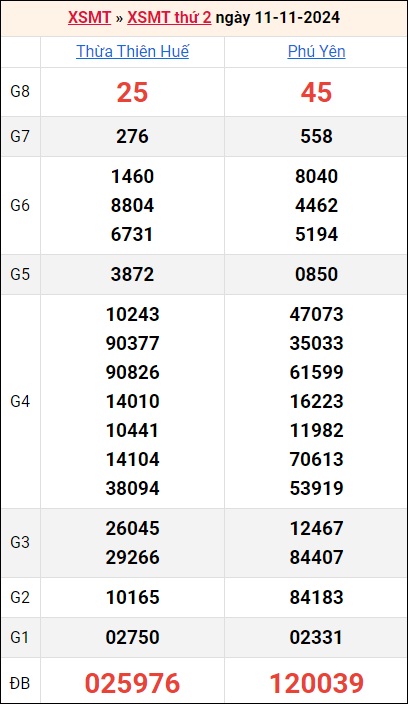 XSMT 18/11. Kết quả xổ số miền Trung hôm nay - XSMT thứ Hai ngày 18/11/2024 sẽ được cập nhật trực tiếp trên LDG. Kết quả các giải thưởng của XSMT ngày 18/11/2024 sẽ được công bố lần lượt từ giải nhất đến giải tám, cuối cùng là giải đặc biệt.