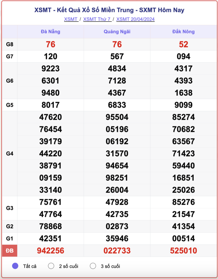 XSMT thứ 7, kết quả xổ số miền Trung ngày 20/4/2024