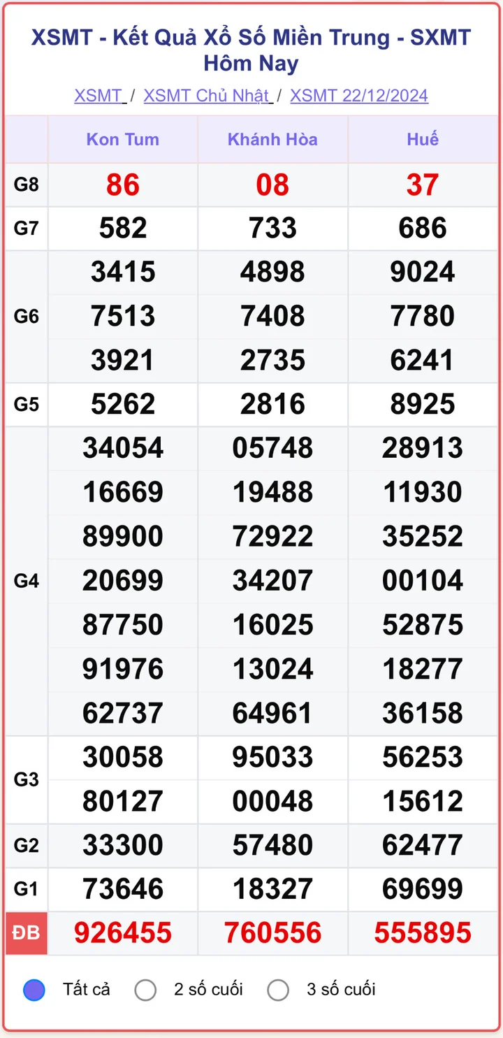 Kết quả xổ số miền Trung (XSMT) được thực hiện lúc 16 giờ 30 phút và được mở thưởng bởi Công ty xổ số kiến thiết của tỉnh Quảng Nam (XSQNA), Đắk Lắk (XSĐL). Kết quả của đài nào sẽ được mở thưởng tại trường quay của tỉnh đó. Xổ số hôm nay - KQXSMT ngày 24/12 được quay thưởng bắt đầu từ giải tám cho đến giải nhất, cuối cùng là công bố kết quả giải đặc biệt.