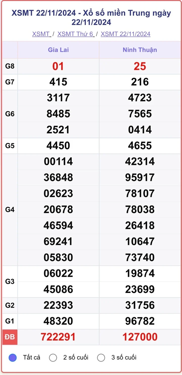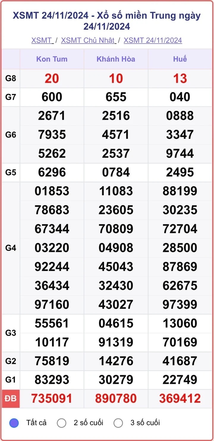 XSMT 27/11. Kết quả xổ số miền Trung hôm nay - XSMT thứ Tư ngày 27/11/2024 sẽ được cập nhật trực tiếp trên LDG. Kết quả các giải thưởng của XSMT ngày 27/11/2024 sẽ được công bố lần lượt từ giải nhất đến giải tám, cuối cùng là giải đặc biệt.