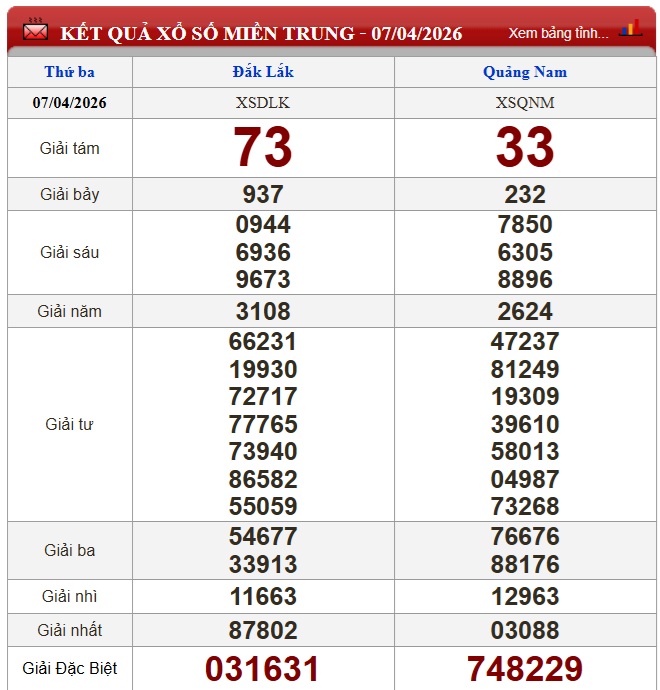 Kết quả xổ số miền Trung (XSMT) hôm nay ngày 7/4
