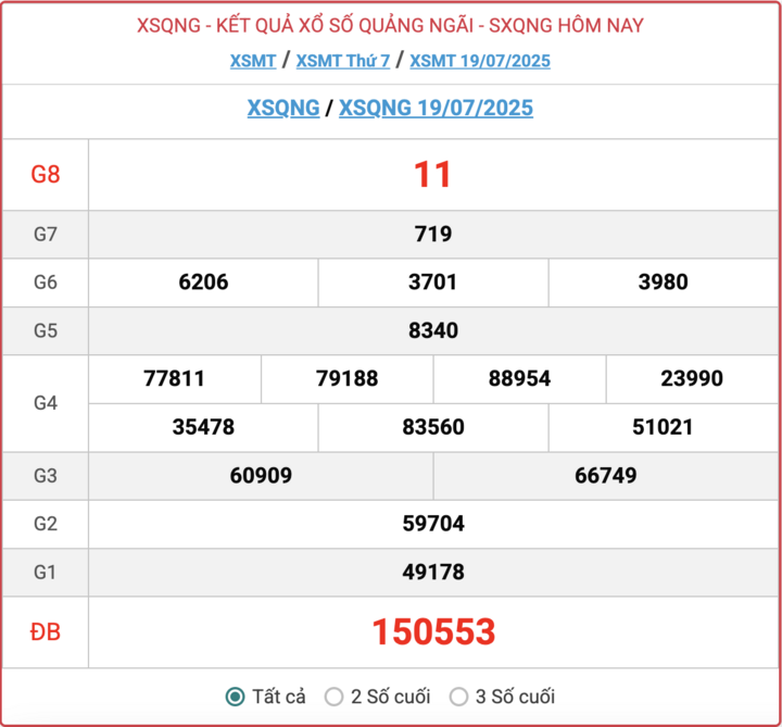 XSQNG 19/7, kết quả xổ số Quảng Ngãi hôm nay 19/7/2025.