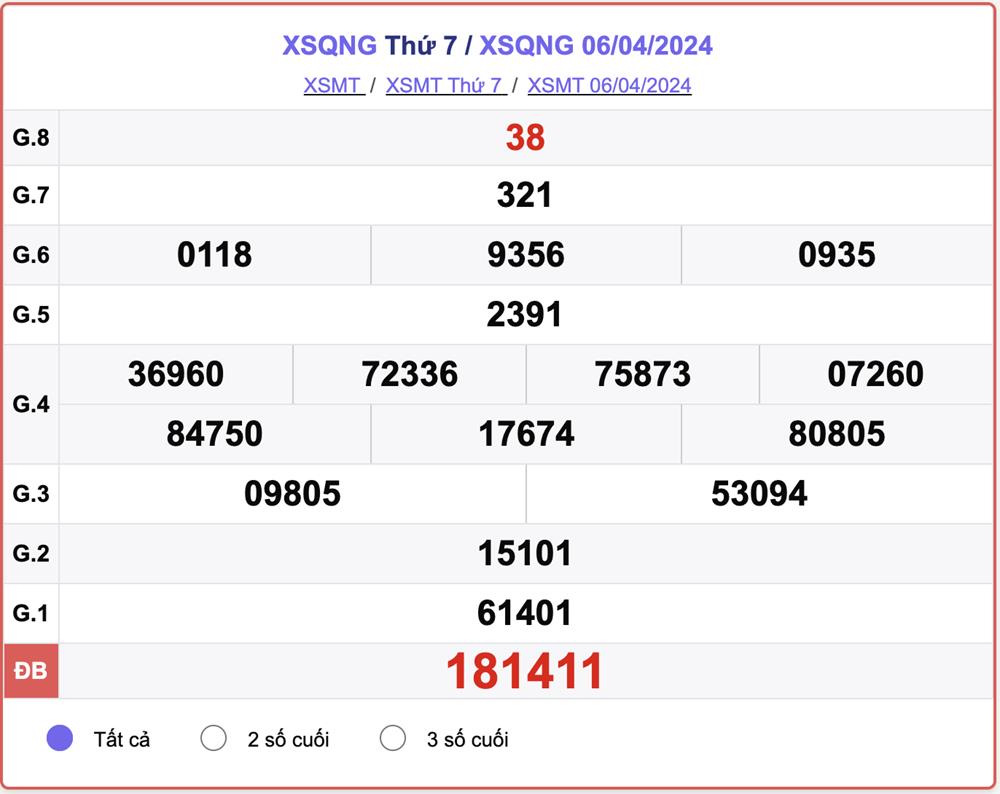 XSQNG thứ 7, kết quả xổ số Quảng Ngãi ngày 6/4/2024.
