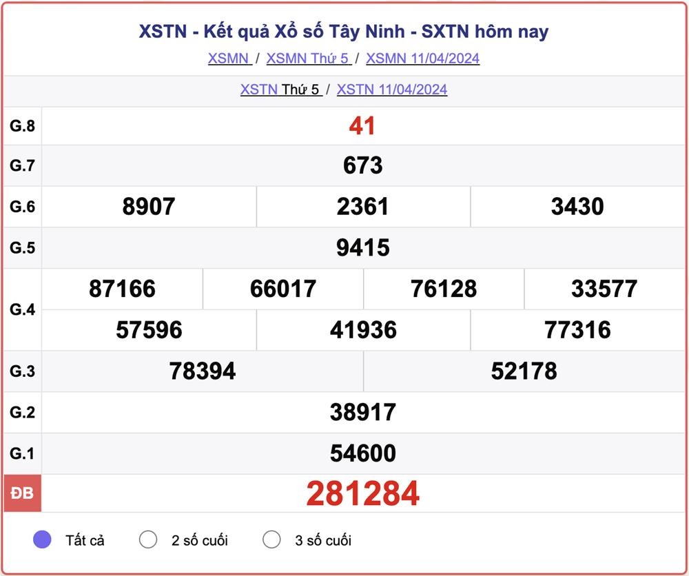 XSTN thứ 5, kết quả xổ số Tây Ninh ngày 11/4/2024