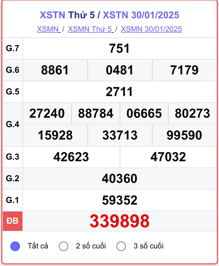 Xem lại Kết quả xổ số Tây Ninh Thứ Năm ngày 23/1/2025