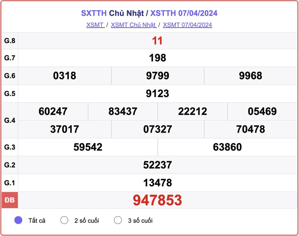 XSTTH Chủ nhật, kết quả xổ số Thừa Thiên Huế ngày 7/4/2024.